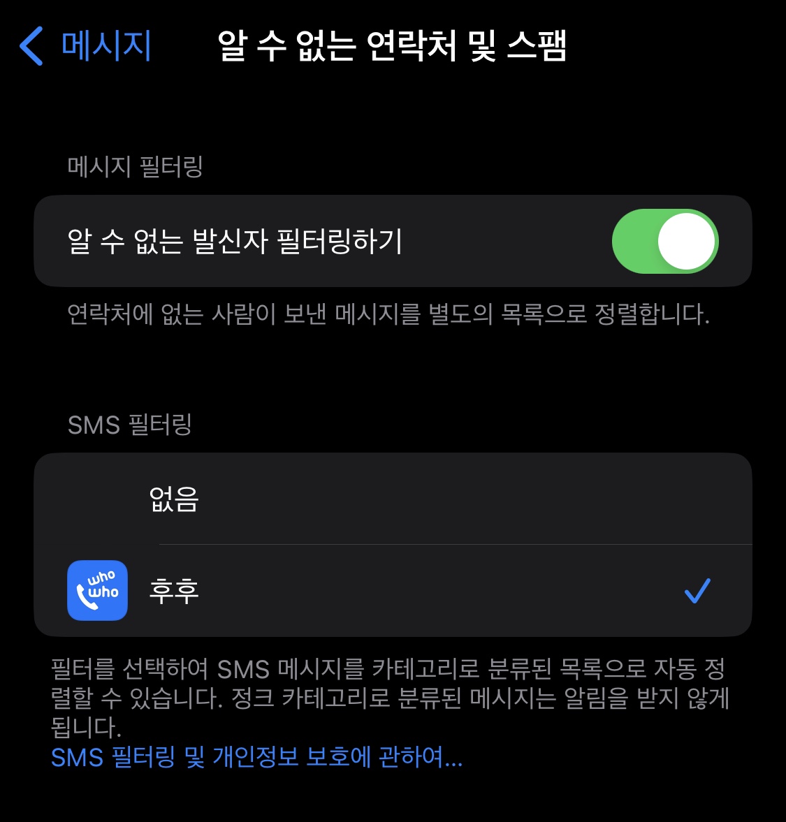 설정 - 메시지 - 알 수 없는 연락처 및 스팸 - SMS 필터링 - 후후 설정이 되어야 한다