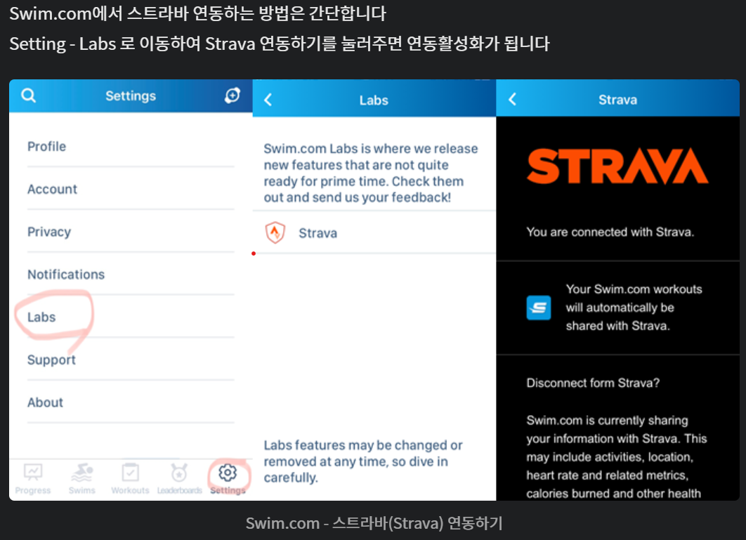 이제는 애플 운동/ Strava/ Swim.com 간의 데이터 연동이 사용자가 신경 쓸 필요가 없이 자동화 되었고, 또 잘됩니다.