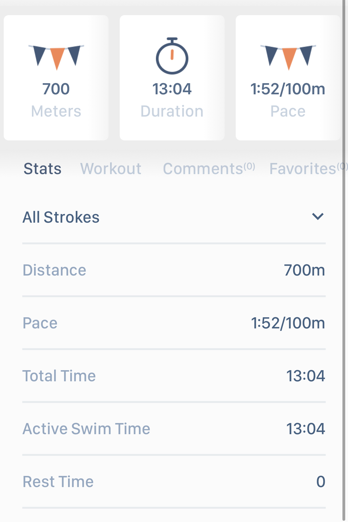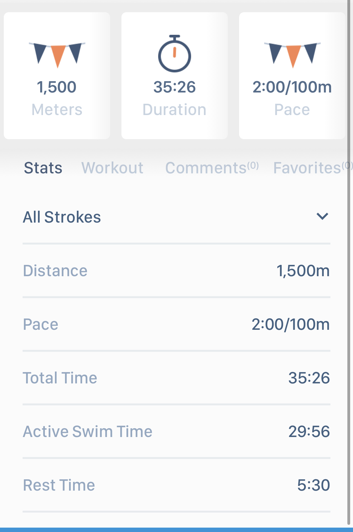 Swim.com 에서는 휴식시간을 제외한 Active 수영 시간만을 가지고 평균 Pace 계산