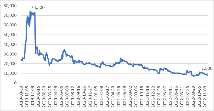 그리고 주가는 흐르고 흘러 유증가격 8천원을 뚫고 내려 7500원에 내려와 있다.
